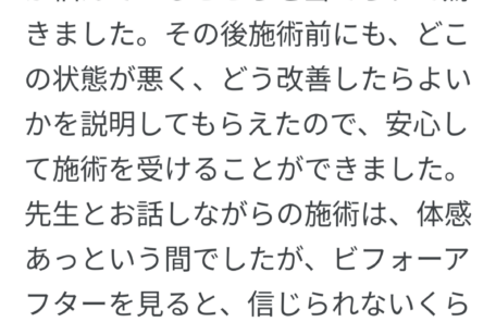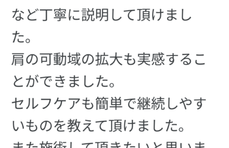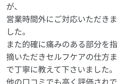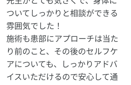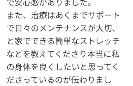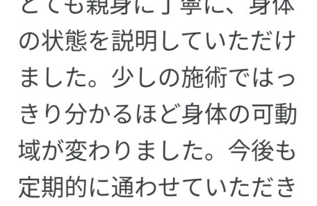 長年痛みが取れず苦しんでいる方に是非一度施術を受けていただくことを おススメしたいです!! 一度で完全に良くなる訳ではないと思いますが、 何度か受けるうちに身体…