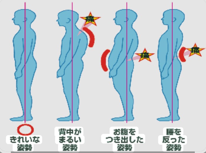 この姿勢では腰の筋肉が常に引っ張られ、立っているだけでも筋肉が緊張したままになります。