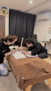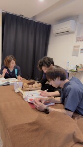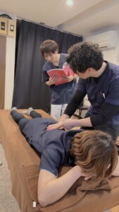 施術の練習(施術方法の確認や手の位置、足の位置や細かなところまで)を行い