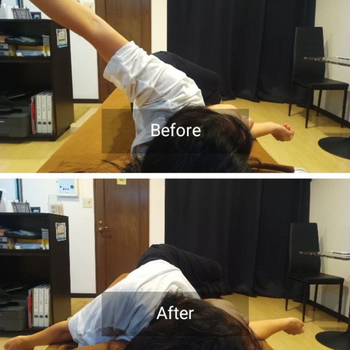 本日のBefore Afterは水平伸展(腕を後に広げる動作)です。
