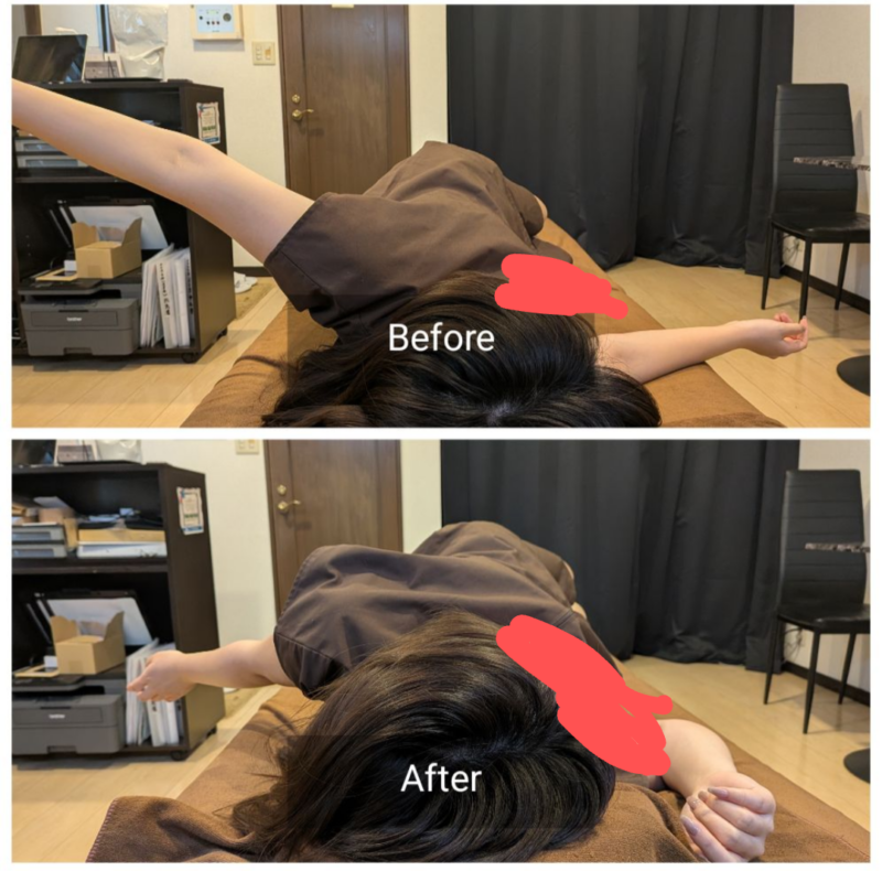 本日のBefore Afterは水平伸展(腕を後に広げる動作)です。